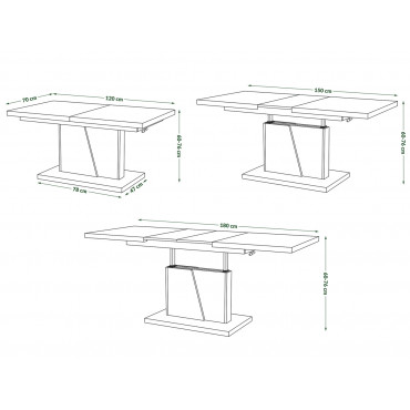 width: 120cm / depth: 70cm / adjustable height: 60-76cm / width when unfolded: 150 or 180cm